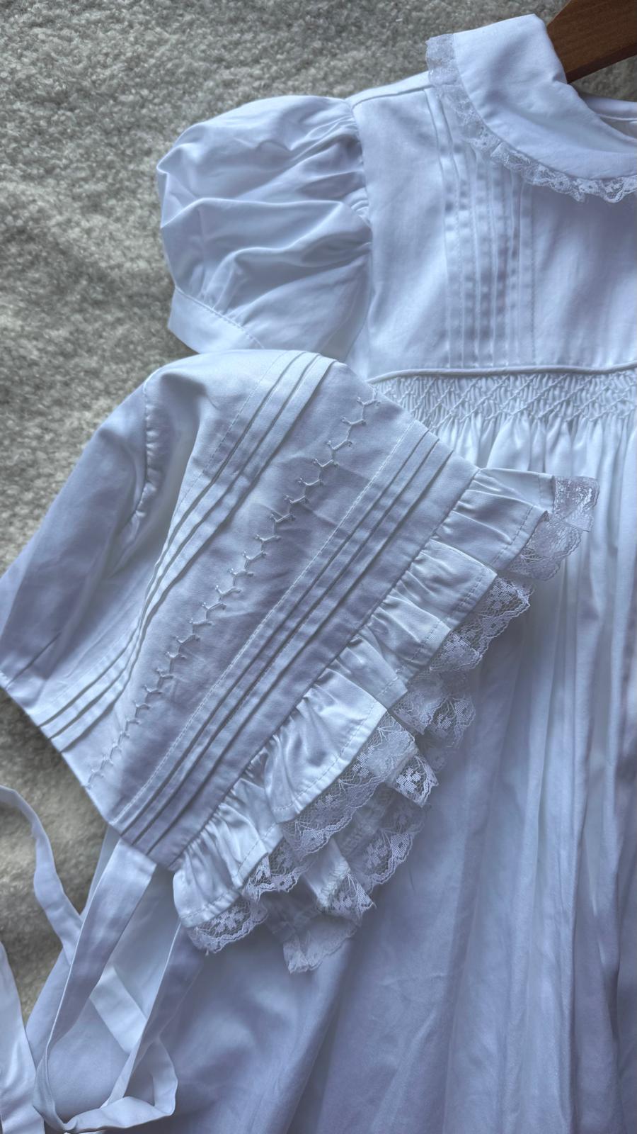 Handcrafted from luxurious cotton sateen, it features delicate hand smocking and fine lace trim for a classic, polished look. Soft ties ensure a comfortable, secure fit for every special occasion from christenings to Christmas celebrations.